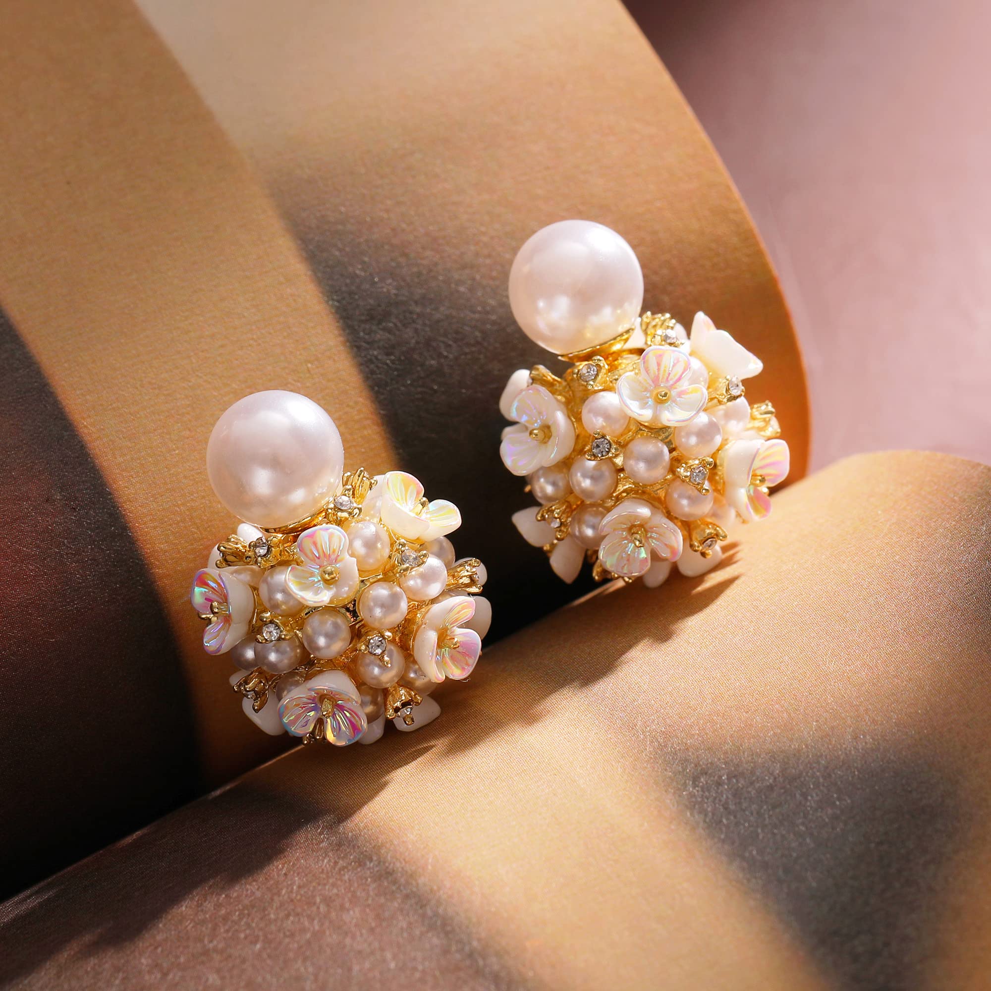 Pearl Flower Ball Stud Earrings - White Cute Ball Back Earrings for Women—