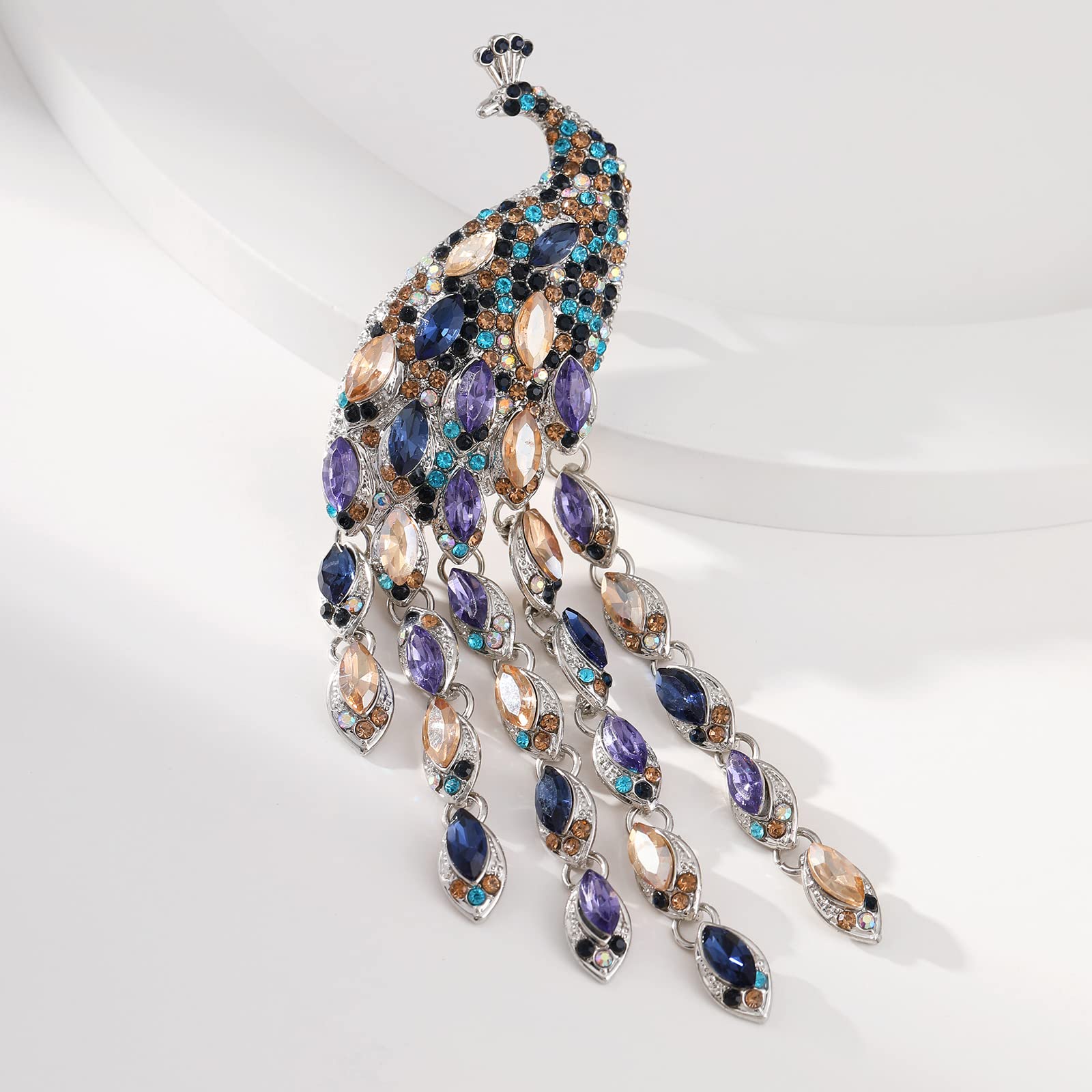 - 【Introduction】This brooch shows a beautiful peacock with rhinestones of various colors, and its tail is designed with tassels, which is a good choice for women's brooches.