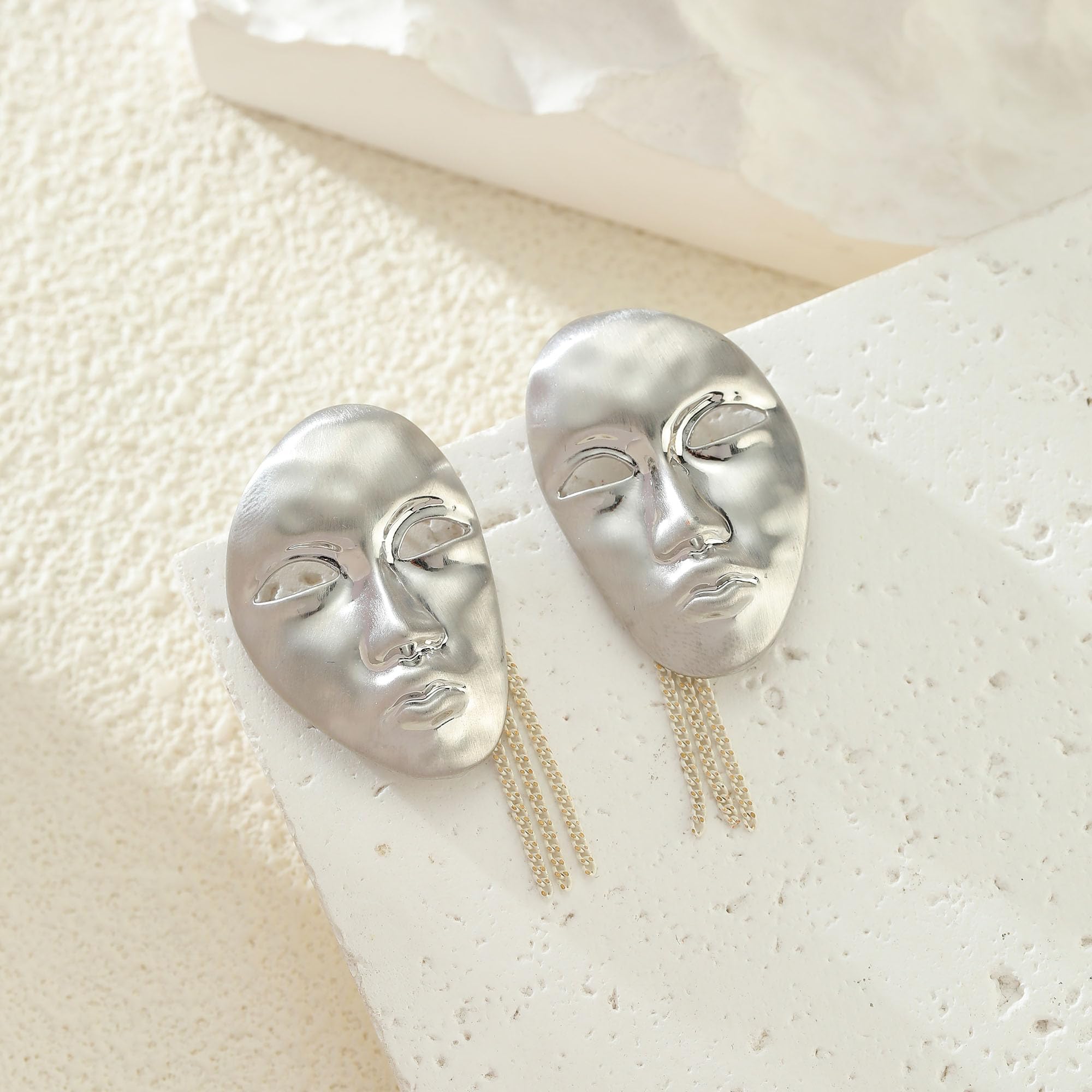 Silver Mask Face Tassel Earrings Statement Dangle Earrings for Women—
