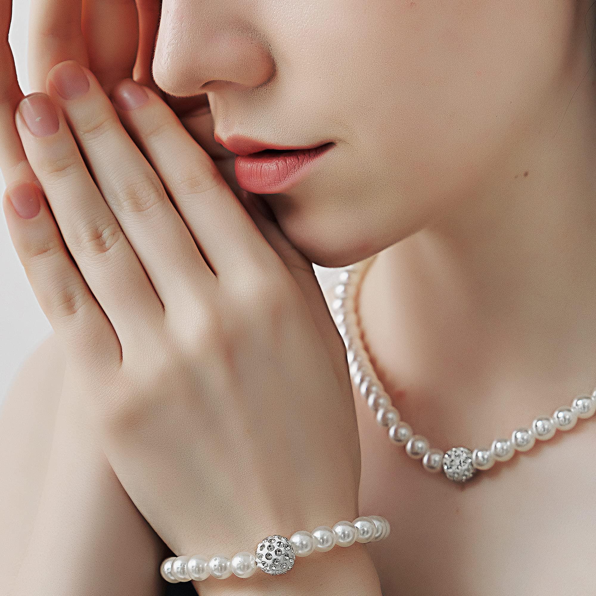 - The set includes a necklace, earrings, and bracelet, all made of high-quality faux pearls.