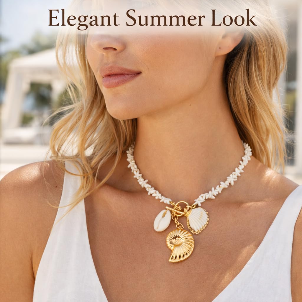 - Coastal Beach Style This shell necklace for women features a coastal-inspired design with creamy shell beads and ocean-themed charms, creating a chic beach necklace look that is perfect for summer outfits, seaside trips, and everyday wear.